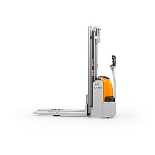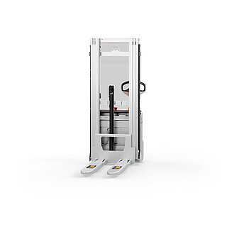 The EXV high lift pallet truck with the unique OptiSpeed tiller is quite something. The speed of this manually guided warehouse assistant is automatically adapted to the distance between the operator and the truck. Note the unique tiller ergonomics: a lot of thought has gone into the positioning of the controls. They allow intuitive one-handed operation for all operators, regardless of hand size and whether left or right. And the LED display on the tiller head allows the operator to keep an eye on all relevant truck information. As if that weren't enough, the truck's stability on slopes and its ability to stop automatically when the tiller arm is released are particularly impressive. Sophisticated lowering damping, which gently slows the lowering speed just before ground contact, protects goods during storage. With the EXV, goods can be stored more tightly than ever before and retrieved more easily. With its high residual load capacity and exceptional manoeuvrability, this compact truck is unbeatable when it comes to moving large quantities of goods quickly and safely in confined spaces with a manual truck, whether in the pre-storage area or on shelving.
